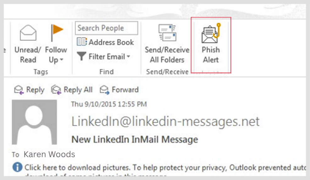 Image: Simulated phishing attack: end user reports email by clicking phish alert button in their Outlook.